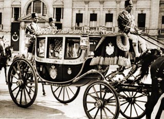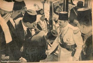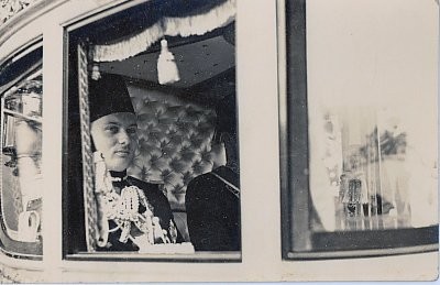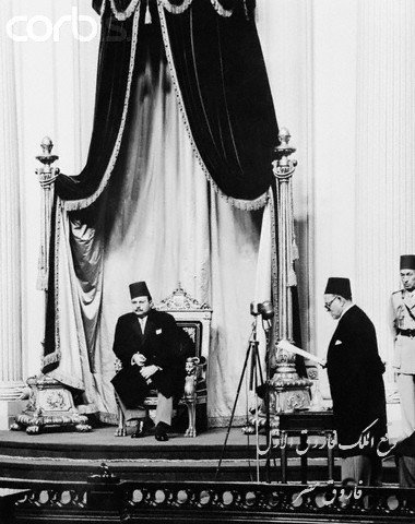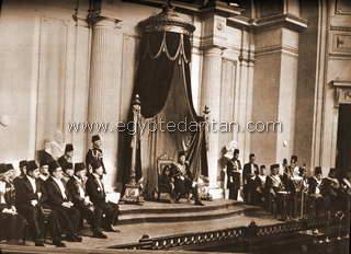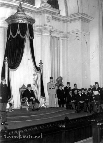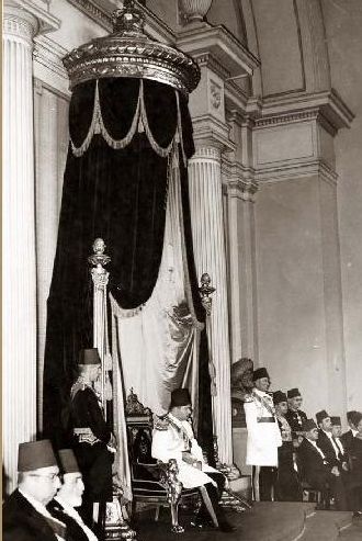 الملك فاروق فى البرلمان سنة 1938 لالقاء خطبة العرش ويلقيها محمد محمود باشا رئيس الوزراء المصرى انذاك