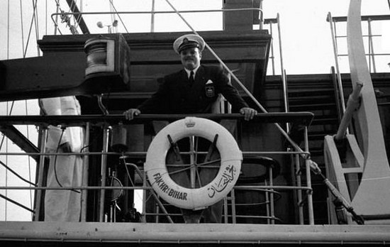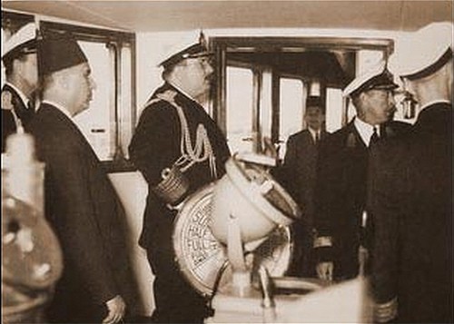 الملك فاروق الاول بملابس البحرية ويظهر فى الصورة جلال علوبة قائد يخت المحروسة