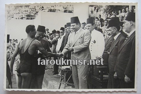 الملك فاروق يكرم احد المتسابقين فى مسابقة للسباحة
