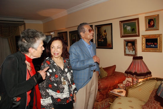 الاميرة فريال والكاتب الصحفى انيس منصور والدكتور لوتس عبد الكريم يشاهدون لوحات للملكة فريدة